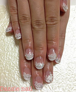 白とバービーピンクの変形フレンチはプリンセス風。一目で目を引くデザインは主役の新婦さまにピッタリ。きれい系でなくぷくっとしたバラはかわいい感じ。ストーンもジュエリーのように華やかで、他の人とはかぶらない個性はブライダルジェルネイルです