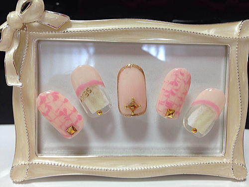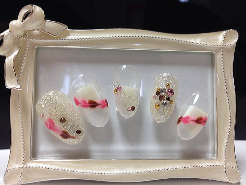 白フレンチとドラックアートを組み合わせたデザイン。ピンク2種とブラウンは相性ぴったりで、ストーンも同じカラーをチョイスしまし