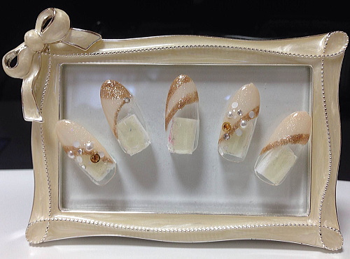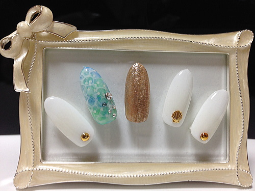 白とゴールド水面のようなデザインが涼しげで合わせてシェルのパーツもいれました。